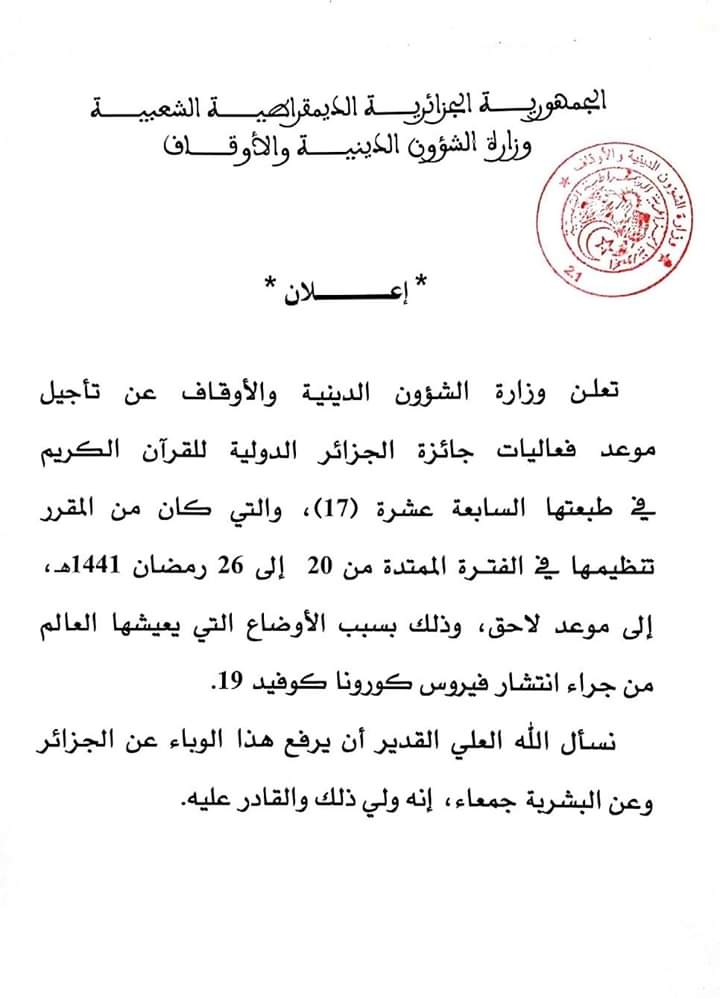 إعلان عن تأجيل موعد فعاليات جائزة الجزائر الدولية للقرآن الكريم في طبعتها السابعة عشرة