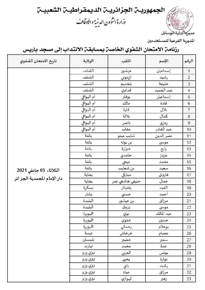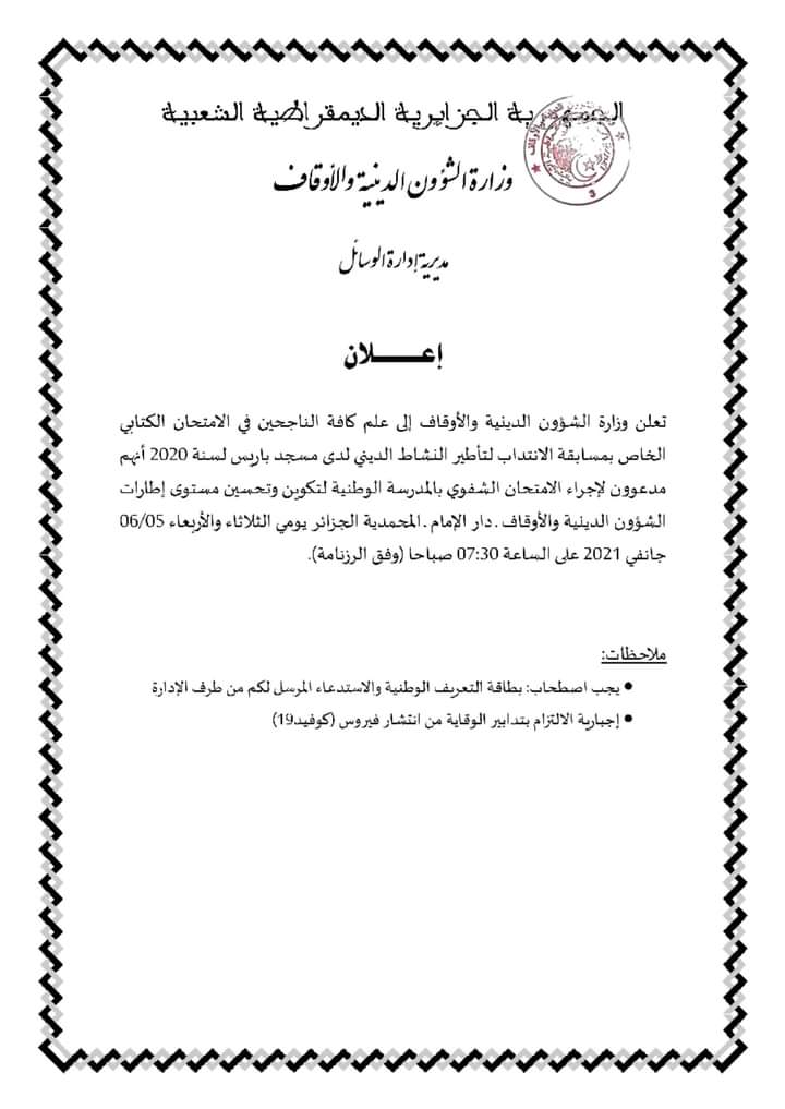 تعلم وزارة الشؤون الدينية والأوقاف كافة الناجحين في الامتحان الكتابي الخاص بمسابقة الانتداب لتأطير النشاط الديني لدى مسجد باريس لســــنة 2020 م،