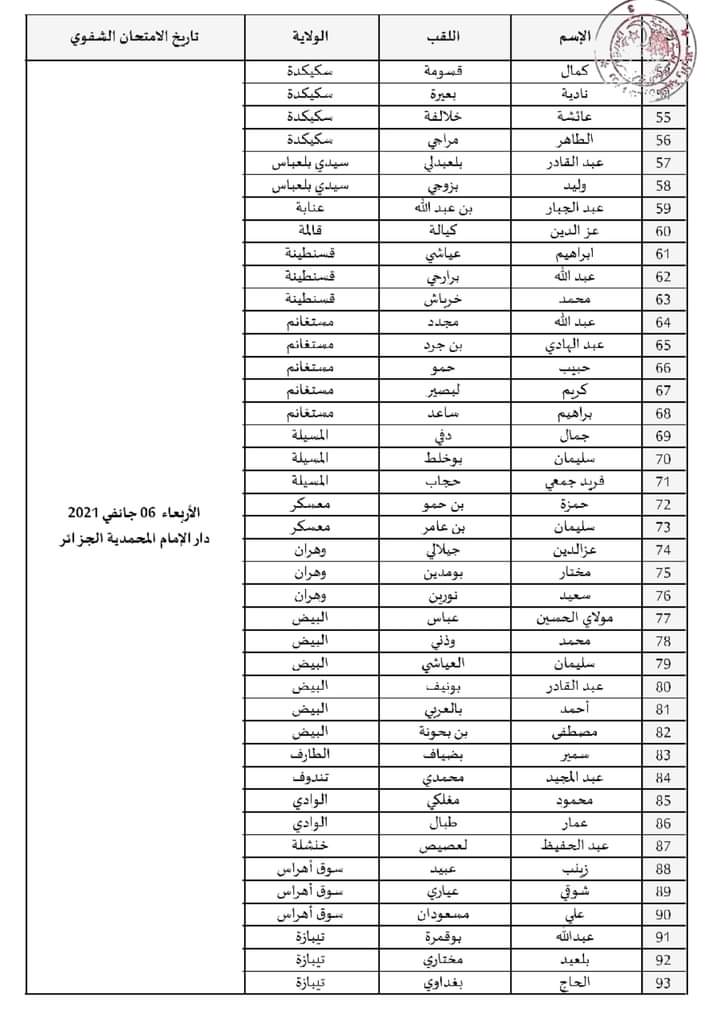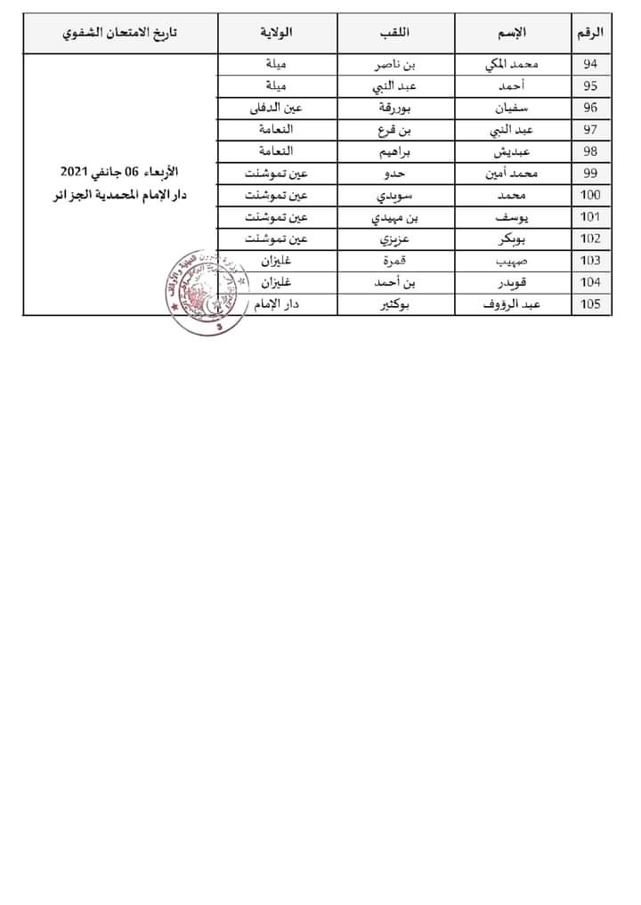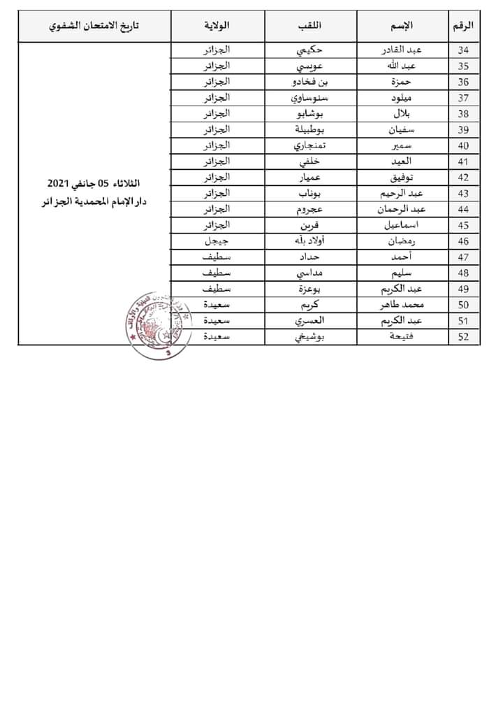 أنهم مدعوون لإجراء الامتحان الشفوي بالمدرسة الوطنية لتكوين وتحسين مستوى إطارات الشؤون الدينية والأوقاف ـ دار الإمام ـ المحمدية الجزائر، يومي الثلاثاء والأربعاء 05/06 جانفي 2021 على الساعة 07:30 صباحا. (وفق الرزنامة)