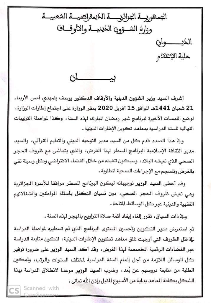 اجتماع السيد وزير الشؤون الدينية والأوقاف مع إطارات الوزارة حول برنامج شهر رمضان و التكوين عن بُعد لطلبة معاهد التكوين