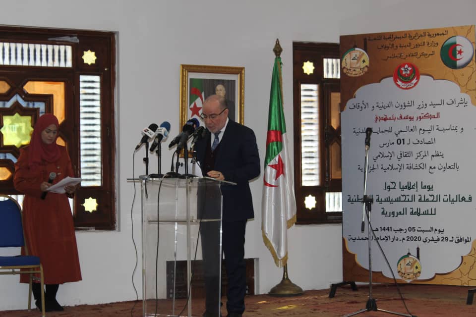 أشرف السيد وزير الشؤون الدينية والأوقاف الدكتور يوسف بلمهدي يوم السبت 5 رجب 1441هـ الموافق 29 فيفري2020 على افتتاح فعاليات الحملة التحسيسية الوطنية للسلامة المرورية الجزائرية بالمدرسة الوطنية لتكوين وتحسين مستوى إطارات الشؤون الدينية والأوقاف - دار الإمام- المحمدية الجزائر التي نظمت من طرف المركز الثقافي الإسلامي بالتعاون مع الكشافة الإسلامية الجزائرية بحضور وزير الصحة وممثلي الدرك الوطني والأمن الوطني والحماية المدنية والكشافة الإسلامية والعديد من الجمعيات المهتمة بالسلامة المرورية، وبعض إطارات وزارة الشؤون الدينية والأوقاف وأئمة من الجزائر العاصمة ،وتم في هذا اليوم تكريم الحماية المدنية بمناسبة اليوم العالمي للحماية المدنية المصادف للفاتح من مارس .
