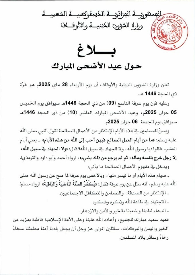 بلاغ بخصوص عيد الأضحى 1446هـ/2025م
