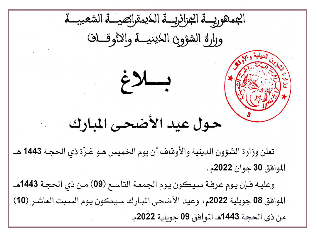 بلاغ حول عيد الأضحى المبارك