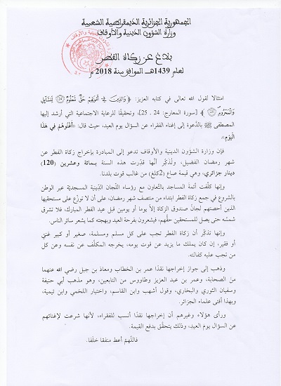 بلاغ عن زكاة الفطر لعام 1439هـ الموافق سنة 2018م