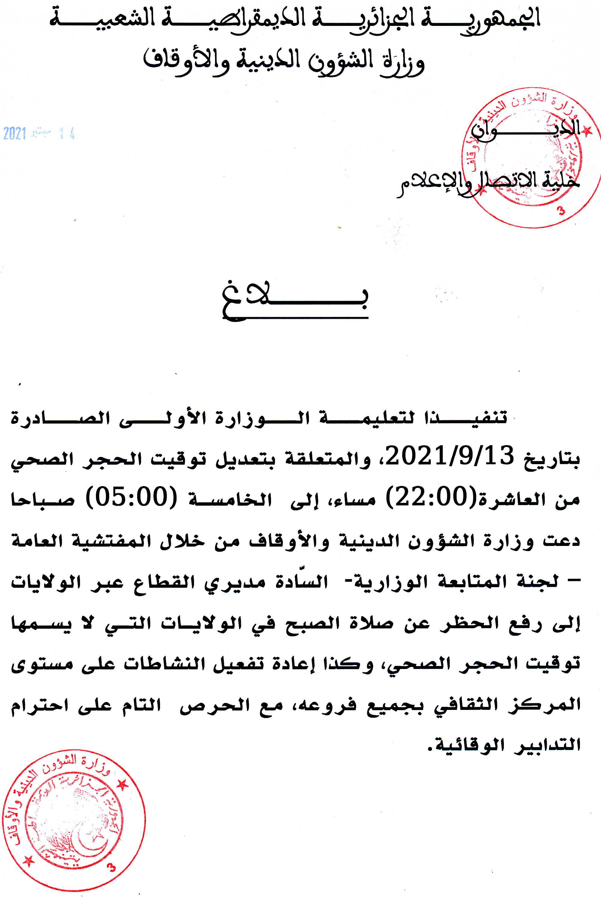 تنفيذا لتعليمة الوزارة الأولى الصادرة بتاريخ 13/9/2021، والمتعلقة بتعديل توقيت الحجر الصحي من العاشرة(22:00) مساء، إلى الخامسة (05:00) صباحا دعت وزارة الشؤون الدينية والأوقاف من خلال المفتشية العامة – لجنة المتابعة الوزارية- السّادة مديري القطاع عبر الولايات إلى رفع الحظر عن صلاة الصبح في الولايات التي لا يمسها توقيت الحجر الصحي، وكذا إعادة تفعيل النشاطات على مستوى المركز الثقافي بجميع فروعه، مع الحرص التام على احترام التدابير الوقائية.