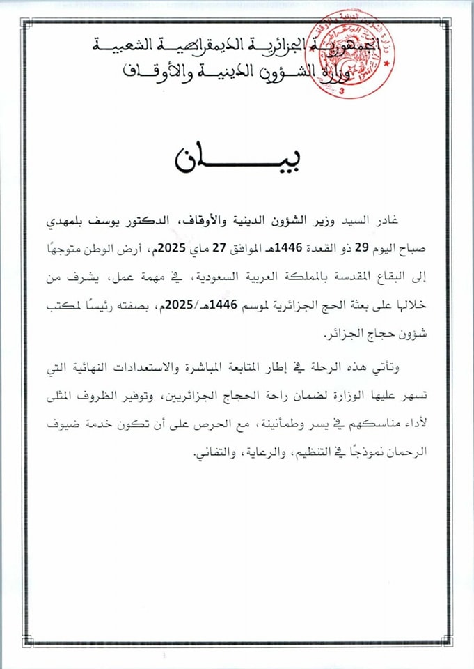 بيان بخصوص مغارة وزير الشؤون الدينية والأوقاف للبقاع المقدسة