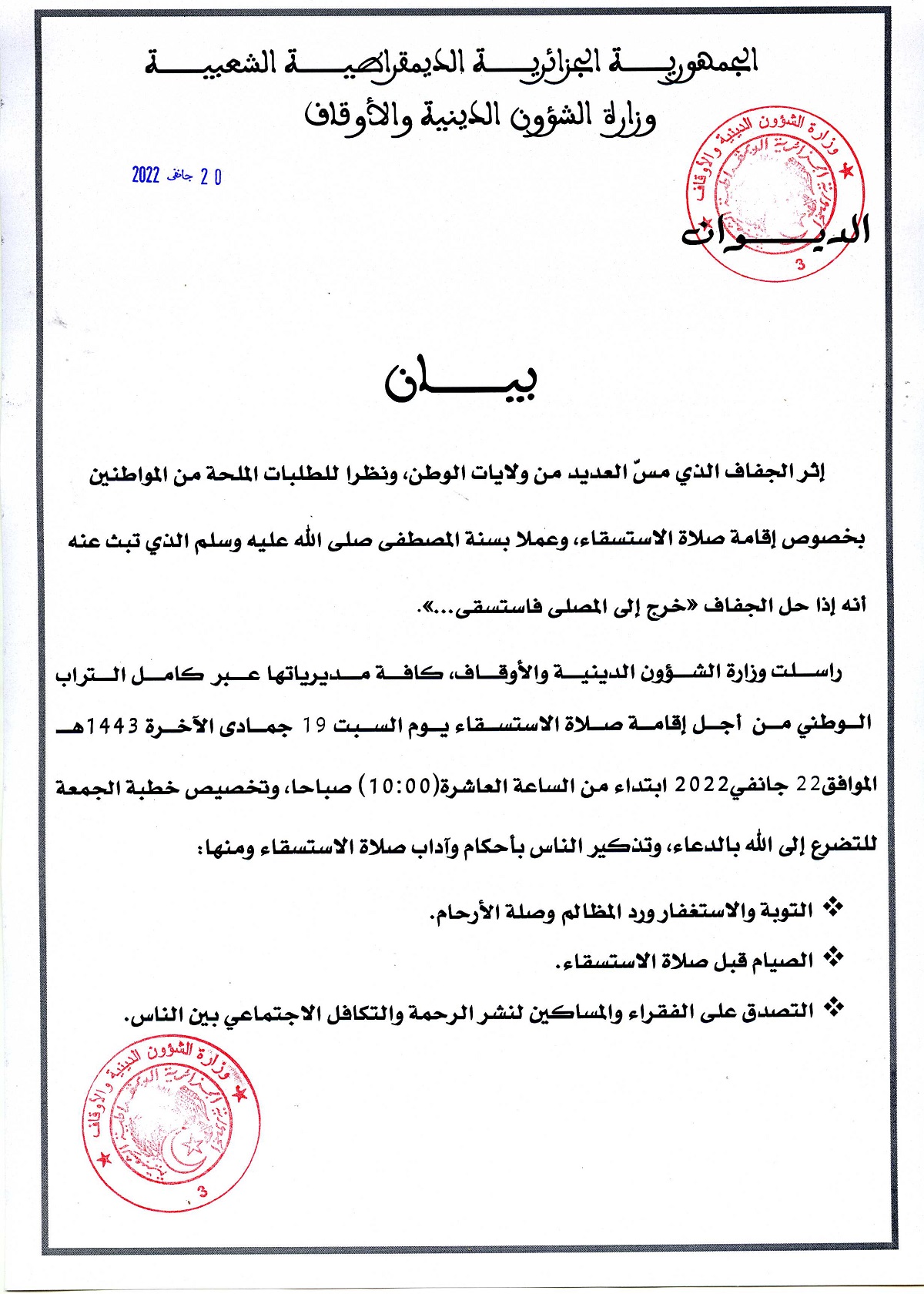 راسلت وزارة الشؤون الدينية والأوقاف، كافة مديرياتها عبر كامل التراب الوطني من أجل إقامة صلاة الاستسقاء يوم السبت 19 جمادى الآخرة 1443هـ، الموافق22 جانفي2022 ابتداء من الساعة العاشرة(10:00) صباحا، وتخصيص خطبة الجمعة للتضرع إلى الله بالدعاء، وتذكير الناس بأحكام وآداب صلاة الاستسقاء ومنها: