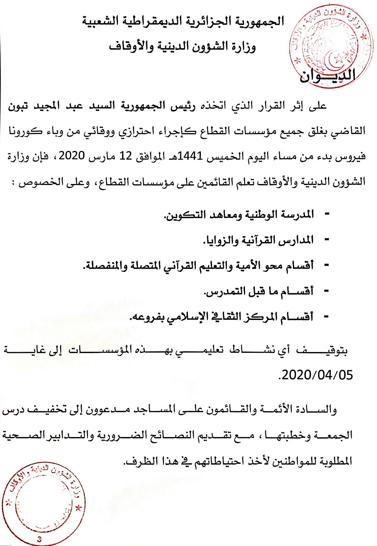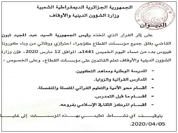 على إثر القرار الذي اتخذه رئيس الجمهورية السيد عبد المجيد تبون القاضي بغلق جميع مؤسسات القطاع كإجراء احترازي ووقائي من وباء كورونا فيروس بدء من مساء اليوم الخميس 1441هـ الموافق 12 مارس 2020، فإن وزارة الشؤون الدينية والأوقاف تعلم القائمين على مؤسسات القطاع، وعلى الخصوص :