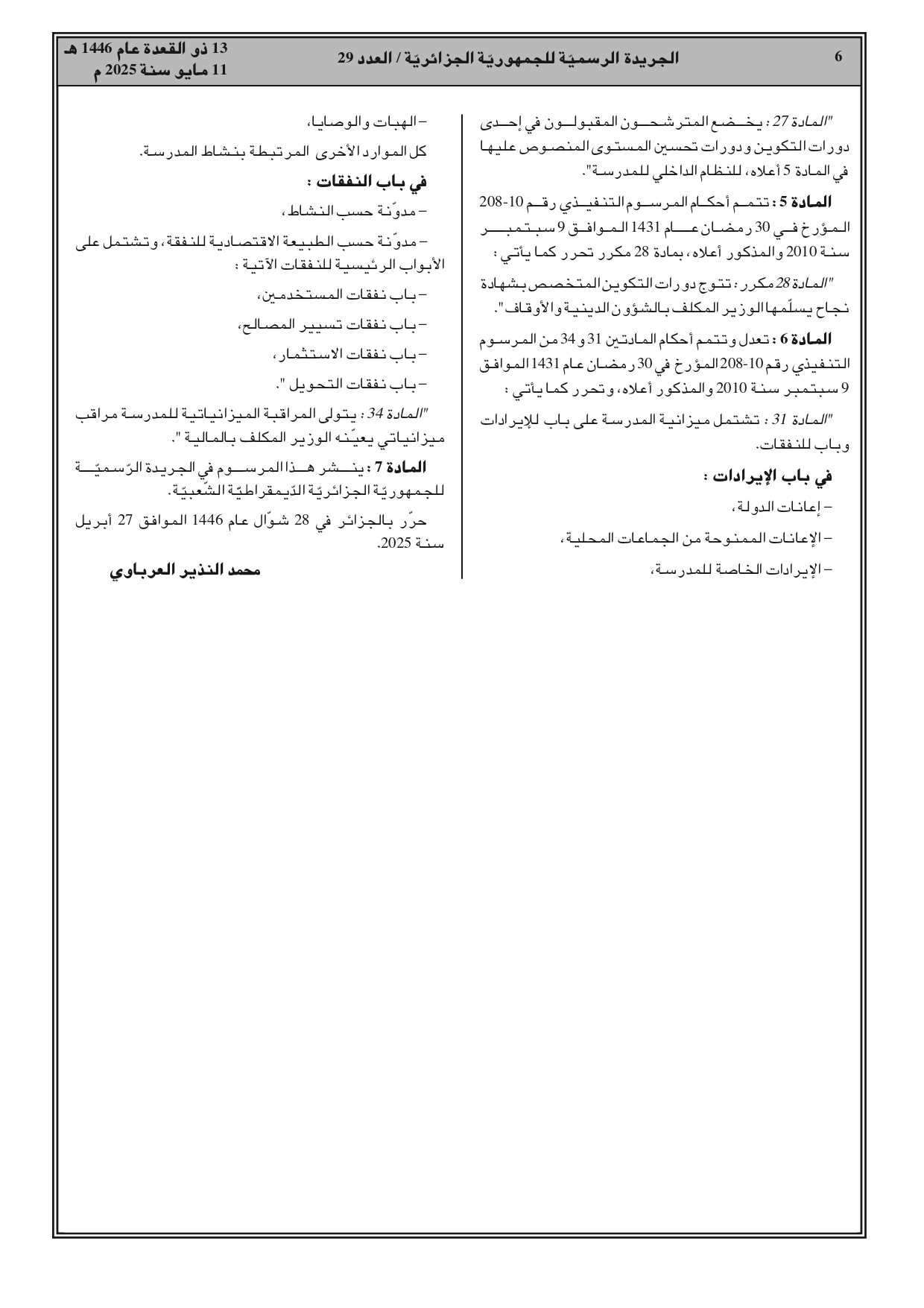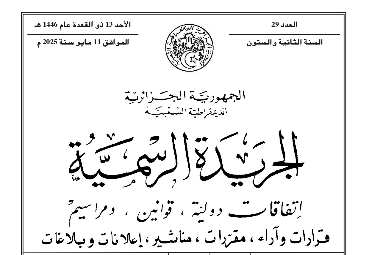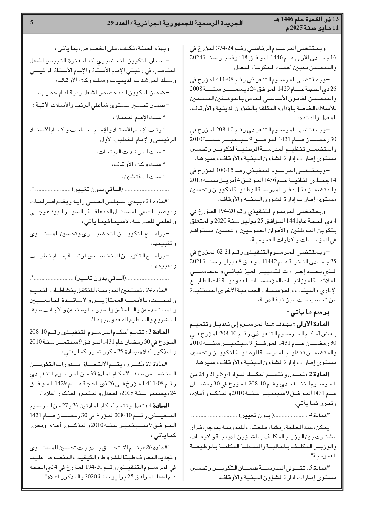 صدور المرسوم التنفيذي رقم 25-136 مؤرخ في 28 شوال عام 1446 الموافق 27 أبريل سنة 2025، يعدل ويتمم المرسوم التنفيذي رقم 10-2008 المؤرخ في 30 رمضان عام 1431 الموافق 9 سبتمبر سنة 2010 والمتضمن تنظيم المدرسة الوطنية لتكوين وتحسين مستوى إطارات إدارة الشؤون الدينية والأوقاف وسيرها.