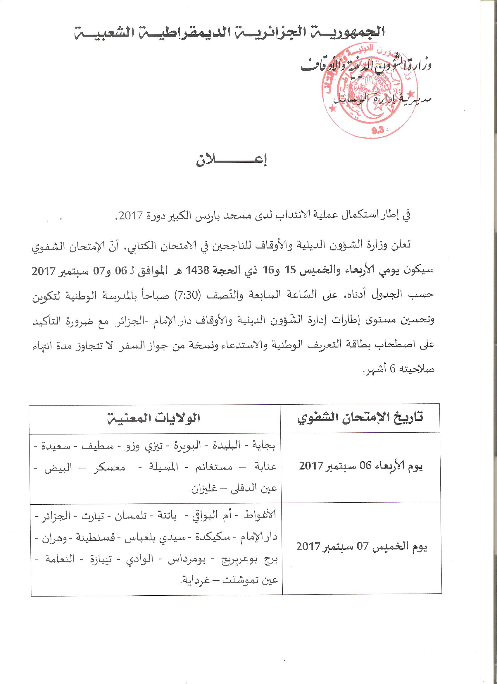 قائمة الناجحين في الامتحان الكتابي للمترشحين للإنتداب لدى مسجد باريس لسنة 2017