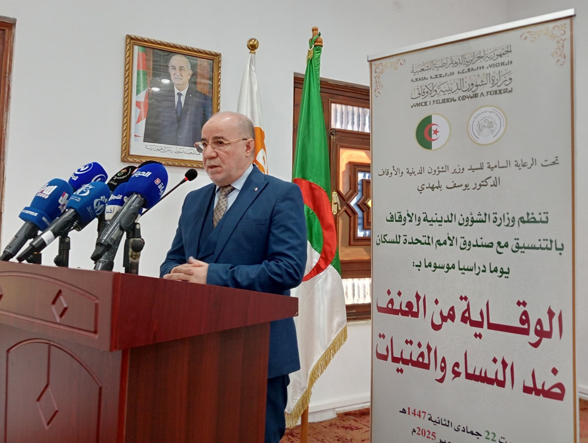 أشرف السيد وزير الشؤون الدينية والأوقاف، الدكتور يوسف بلمهدي، اليوم 13 ديسمبر 2025، بدار الإمام بالمحمدية، على افتتاح ندوة وطنية موسومة بـ: "الوقاية من العنف ضد النساء والفتيات"، التي تنظمها وزارة الشؤون الدينية والأوقاف بالتنسيق مع مكتب صندوق الأمم المتحدة للسكان بالجزائر، وبمشاركة ممثلي عدد من القطاعات الرسمية والأسلاك الأمنية، إلى جانب الأئمة والمرشدات الدينيات وممثلي المجتمع المدني.