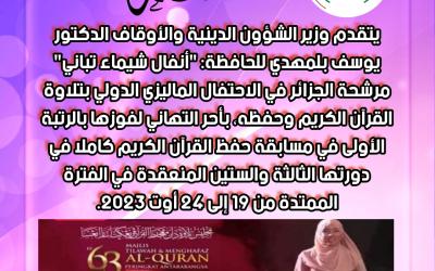 بتكليف من وزير الشؤون الدينية والأوقاف الدكتور يوسف بلمهدي تم مساء اليوم 25 أوت 2023 بالمطار الدولي هواري بومدين، استقبال الحافظة: "أنفال شيماء تباني" المتوجة بالرتبة الأولى في المسابقة الدولية لحفظ القرآن الكريم بـدولة ماليزيا من طرف إطارات الوزارة؛ المدير ا