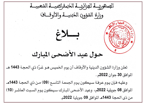 بلاغ حول عيد الأضحى المبارك