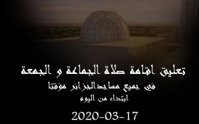 على إثر القرارات الهامة والحازمة و الحكيمة التي اتخذتها السلطات العمومية لمواجهة وباء فيروس كورونا والوقاية منه، والتي كان من بينها اللجوء إلى تعليق صلاة الجمعة والجماعات وغلق المساجد ودور العبادة في كل ربوع الوطن.