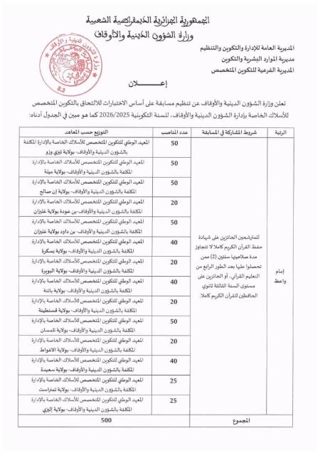 إعلان عن تنظيم مسابقة على أساس الاختبارات للالتحاق بالتكوين المتخصص
