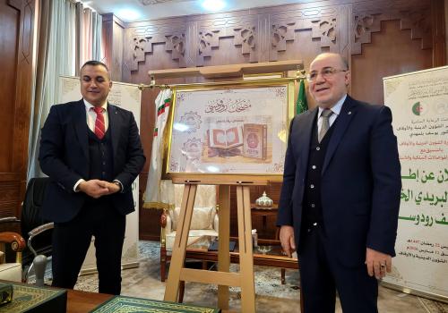 وزير الشؤون الدينية والأوقاف رفقة وزير البريد والمواصلات السلكية واللاسلكية يشرفان على إطلاق طابع بريدي خاص بمصحف رودوسي