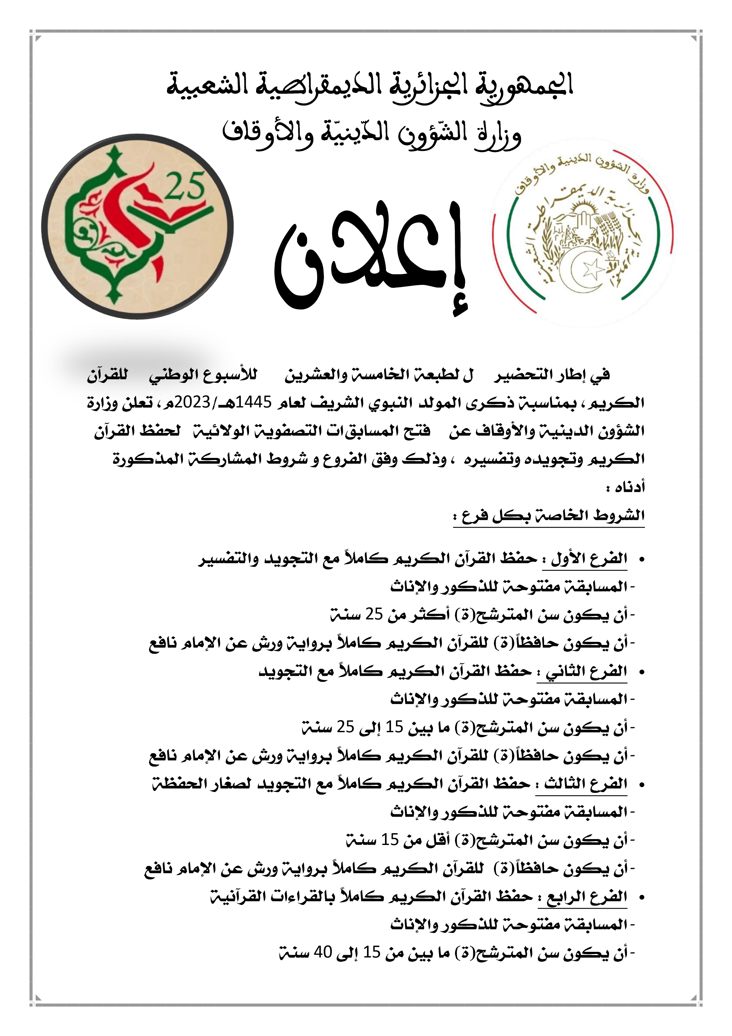 في إطار التحضير للطبعة الخامسة والعشرين للأسبوع الوطني للقرآن الكريم، بمناسبة ذكرى المولد النبوي الشريف لعام 1445هــ/2023م، تعلن وزارة الشؤون الدينية والأوقاف عن فتح المسابقات التصفوية الولائية لحفظ القرآن الكريم وتجويده وتفسيره، وذلك وفق الفروع و شروط المشاركة المذكورة أدناه :