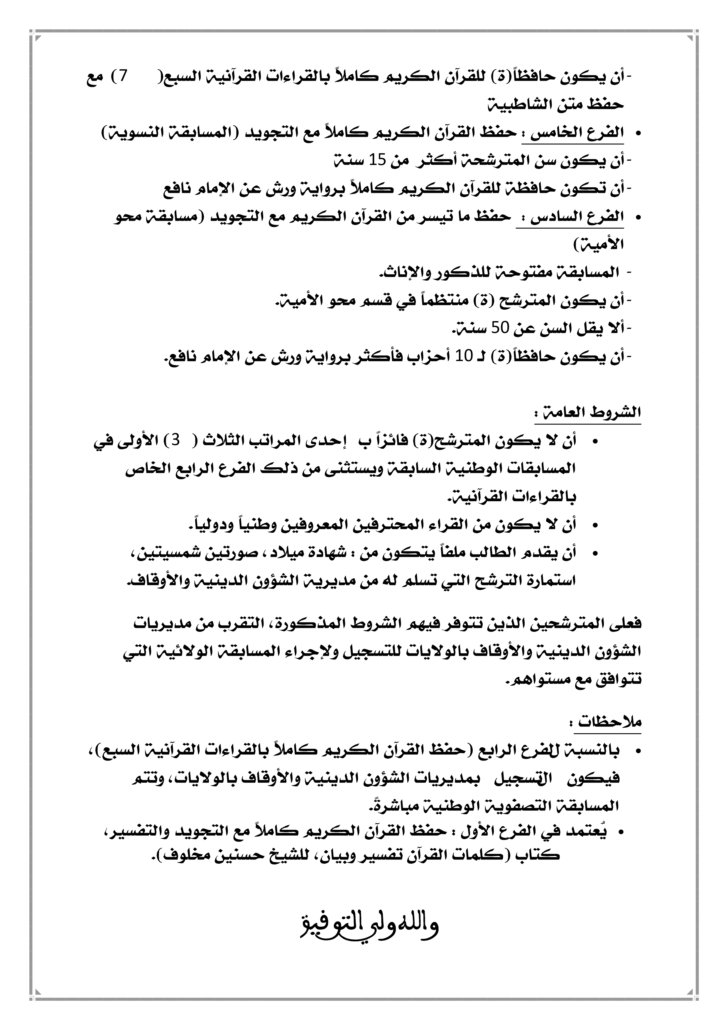 أن لا يكون المترشح(ة) فائزاً بإحدى المراتب الثلاث (3) الأولى في المسابقات الوطنية السابقة ويستثنى من ذلك الفرع الرابع الخاص بالقراءات القرآنية.