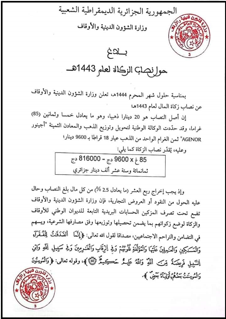 تعلن وزارة الشؤون الدينية والأوقاف أن نصاب الزكاة لهذا العام يقدر بـ   000 816 دج
