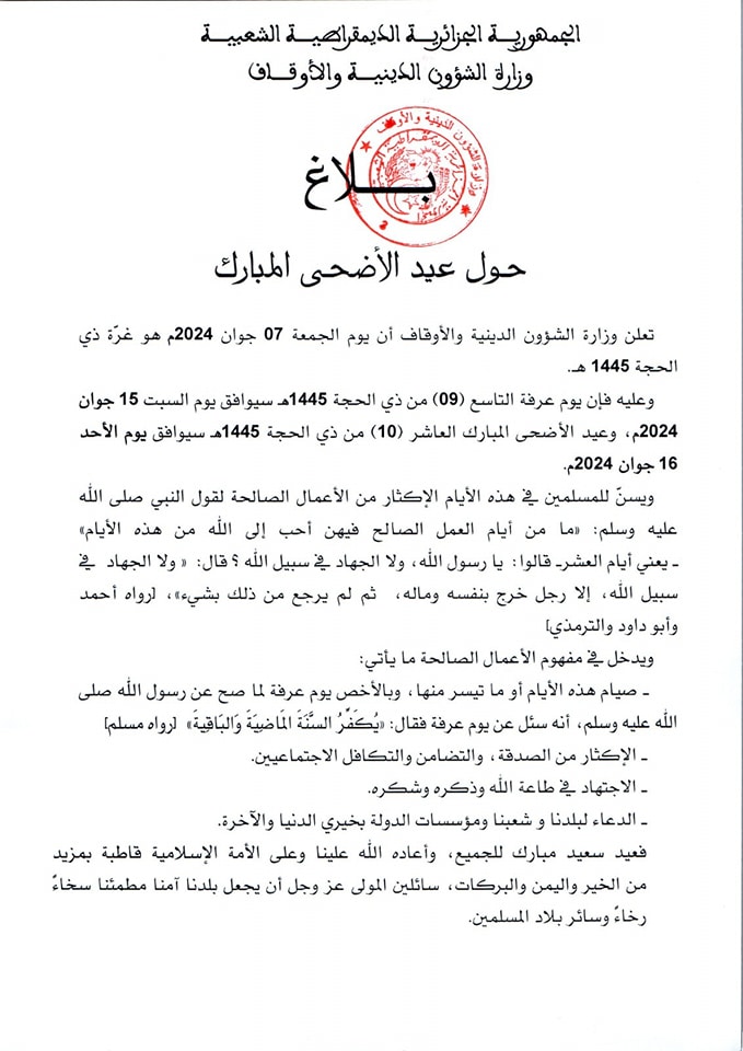 بلاغ عن عيد الأضحى المبارك 1445هـ/2024م