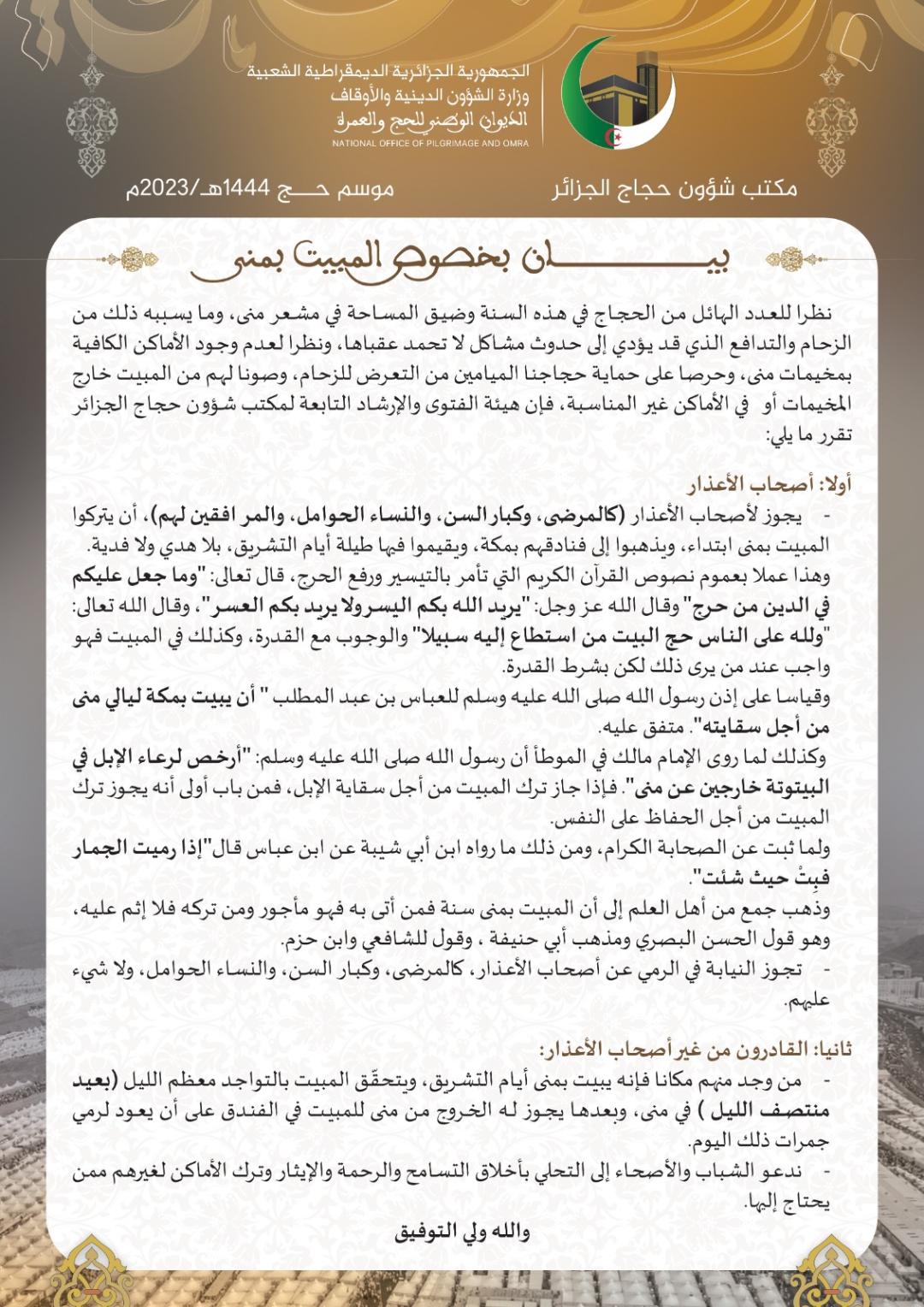 نظرا للعدد الهائل من الحجاج في هذه السنة وضيق المساحة في مشعر مِنىً، وما يسببه ذلك من الزحام والتدافع الذي قد يؤدي إلى حدوث مشاكل لا تحمد عقباها، ونظرا لعدم وجود الأماكن الكافية بمخيمات منى، وحرصا على حماية حجاجنا الميامين من التعرض للزحام، وصونا لهم من المبيت خارج المخيمات أو في الأماكن غير المناسبة، فإن هيئة الفتوى والإرشاد التابعة لمكتب شؤون حجاج الجزائر تقرر ما يلي: