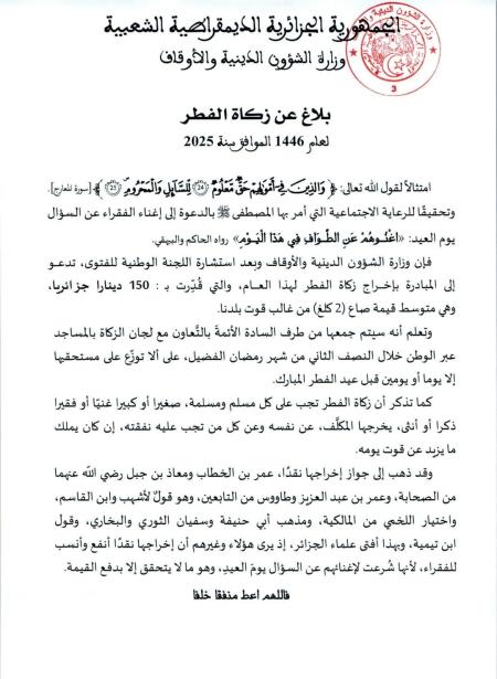 بلاغ عن زكاة الفطر لعام 1446 هجرية الموافق 2025 ميلادية