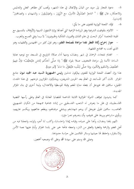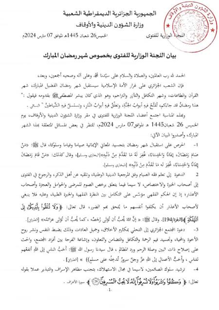 بيان اللجنة الوزارية للفتوى بخصوص شهر رمضان المبارك