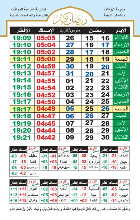 إمساكية رمضان لسنة 1445هـ / 2024م لولاية الجزائر العاصمة والولايات المرتبطة بها