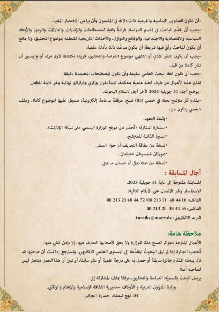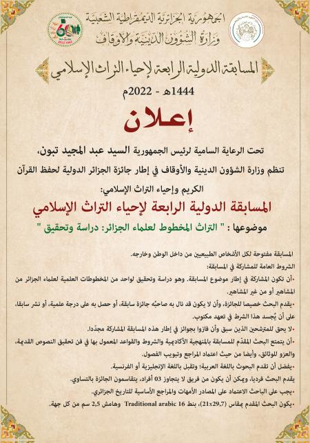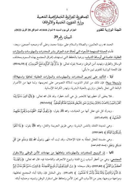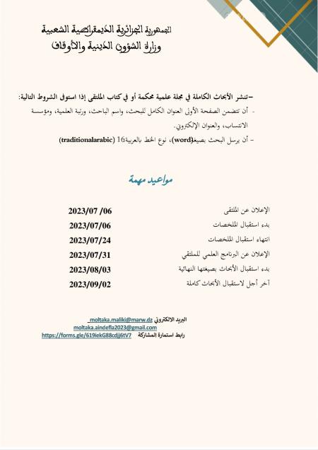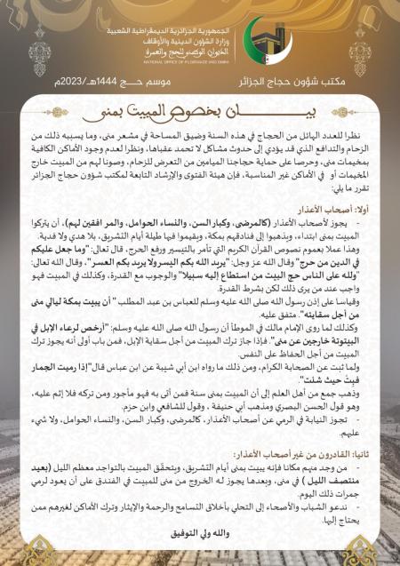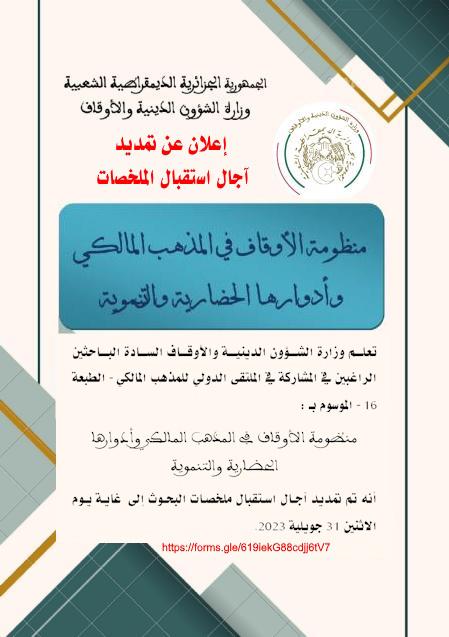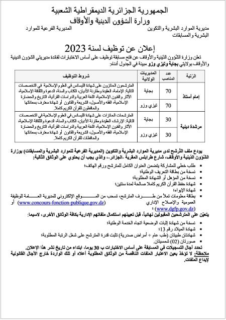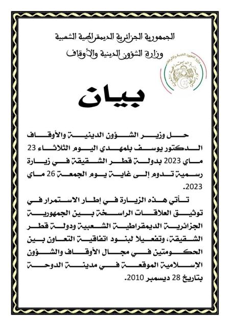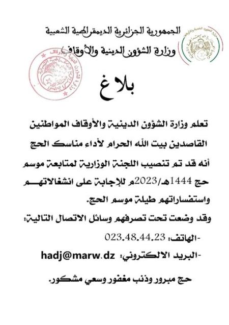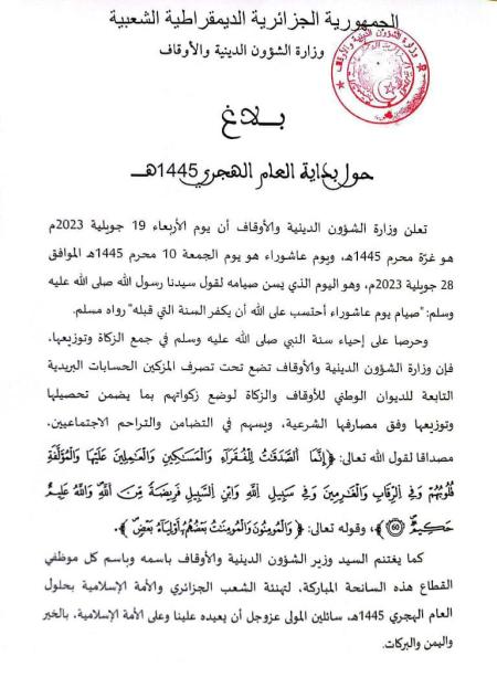 تعلن وزارة الشؤون الدينية والأوقاف أن يوم الأربعاء 19 جويلية 2023م هو غرة محرم 1445هـ
