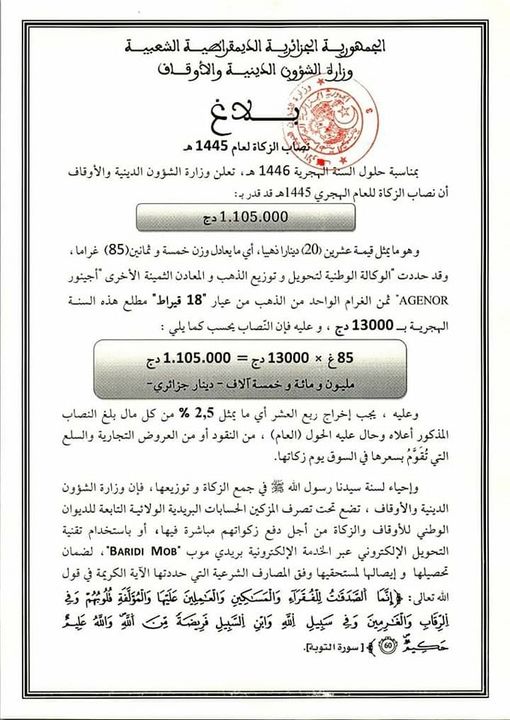 بلاغ حول نصاب الزكاة لعام 1445 هـ