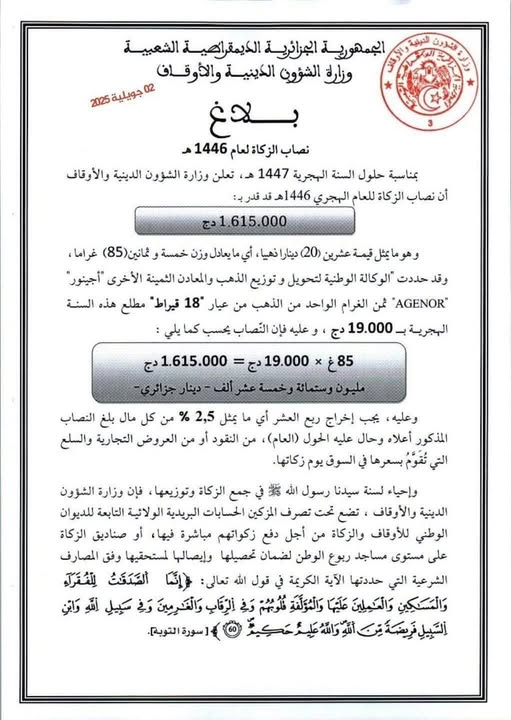 بلاغ حول نصاب الزكاة لعام 1446 هـ